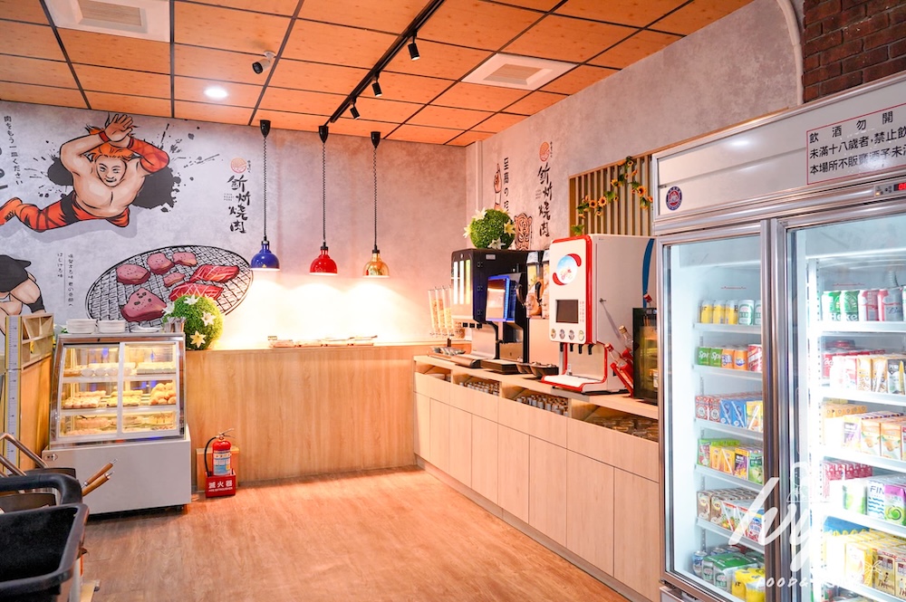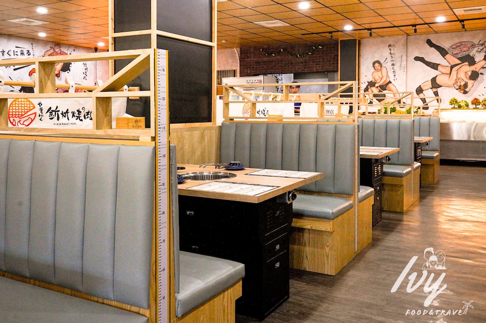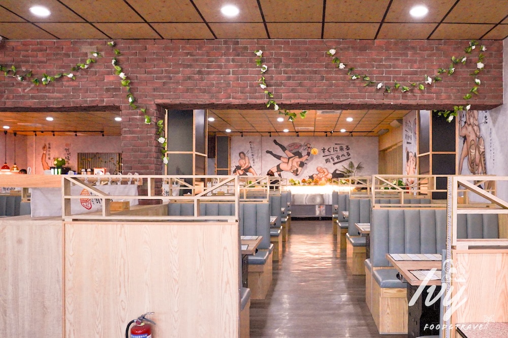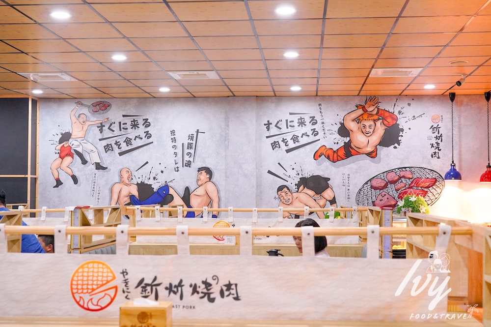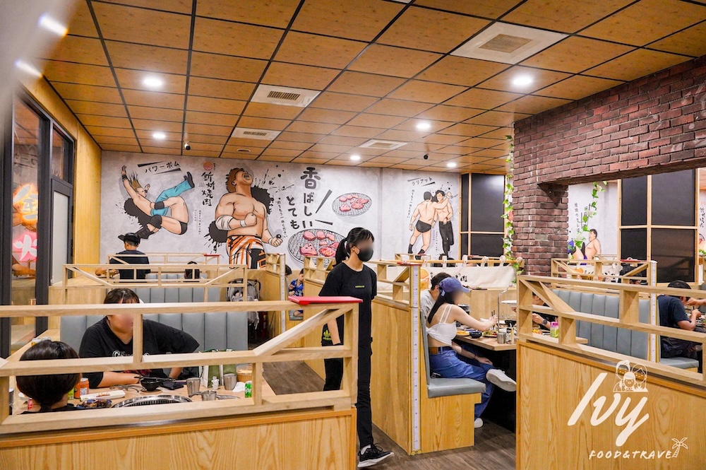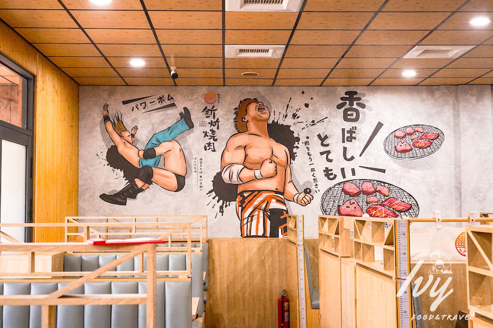 釿炘燒肉內用環境,蠻寬敞明亮的,裝潢設計蠻獨特的,牆面都有摔角的逗趣漫畫圖繪,看的我會心一笑。