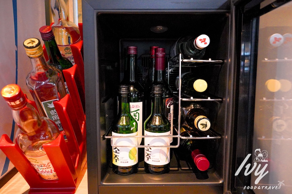還有一整櫃的進口酒、有韓國燒酒、紅酒、威士忌、日本酒,在這裡都能無限暢飲,而且還可以自己調酒,簡直是酒客的喝酒天堂~