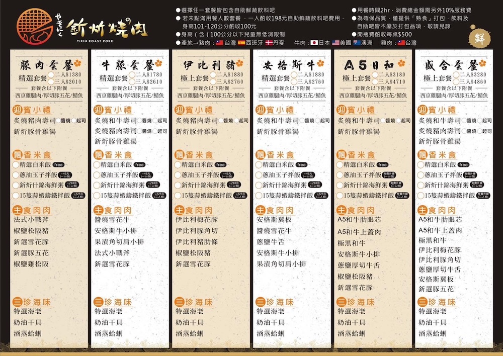 釿炘燒肉菜單提供雙人套餐和三人套餐,價格落在1380~4860元,不吃牛有豚肉套餐可選,