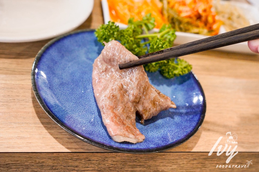 台中燒肉店的前菜大多數是沙拉,但釿炘燒肉竟然是炙燒壽司,真的是走出不同路線的台中海線燒肉店!炙燒和牛壽司(起司),炙燒和牛趁熱吃肉比較軟,用起司調味味道更香濃滑順。