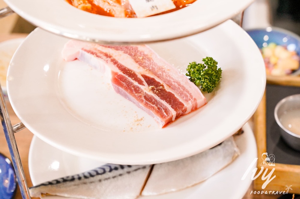 伊比利梅花豚,油花就像大理石紋路般漂亮,吃起來肥而不膩,口感軟嫩多汁,搭配清爽的泡菜吃超解油膩感。