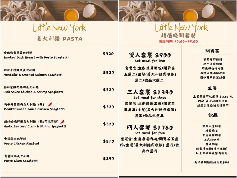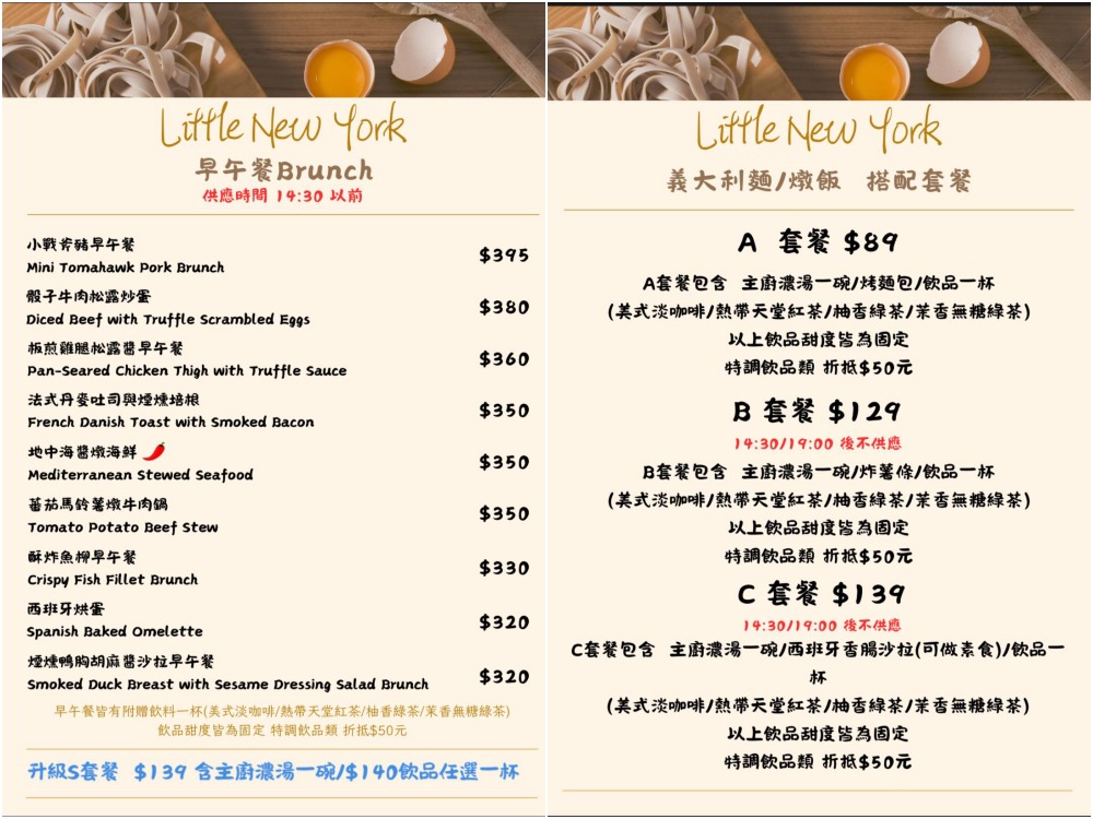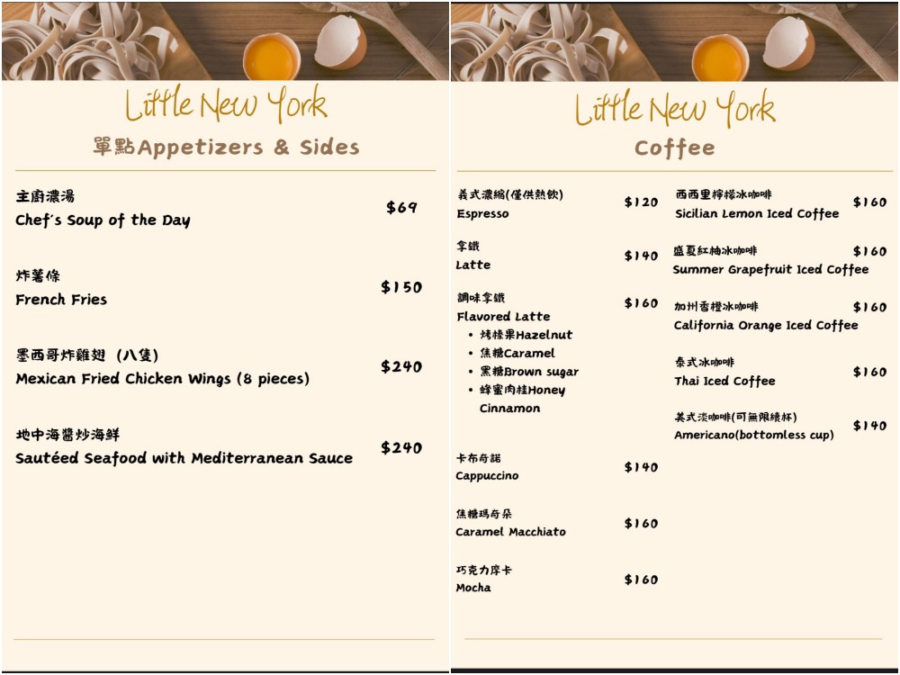 小紐約菜單主打大份量早午餐拼盤、義大利麵、燉飯等選擇豐富的義式料理,餐點價格從$260~$390元間,早午餐皆會附贈紅茶/美式咖啡/花果茶擇一,覺得只有主食太過單調,義式料理和早午餐都有加價購的套餐選擇,含主廚濃湯、麵包、飲料!其餘還有炸物、沙拉、咖啡、冰沙等品項。