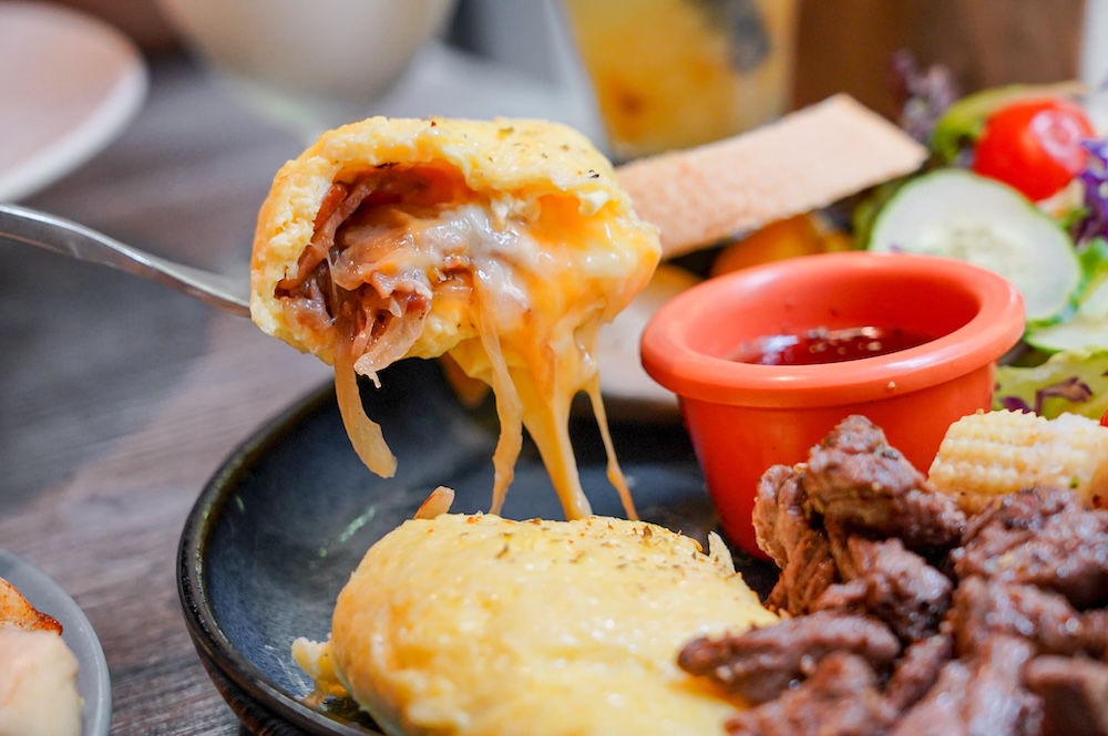 歐姆蛋裡面居然包裹著拌炒過的炒培洋蔥和起司,一切開牽絲起司超邪惡,一口咬下,蛋香、起司香交織著培根的鹹甜不膩口滋味,好幸福啊!
