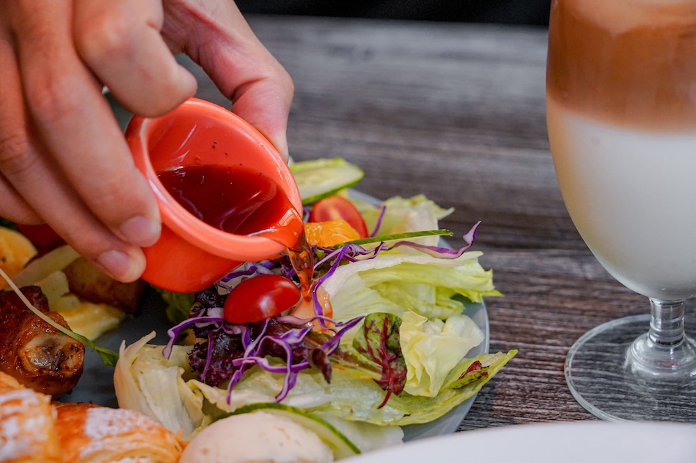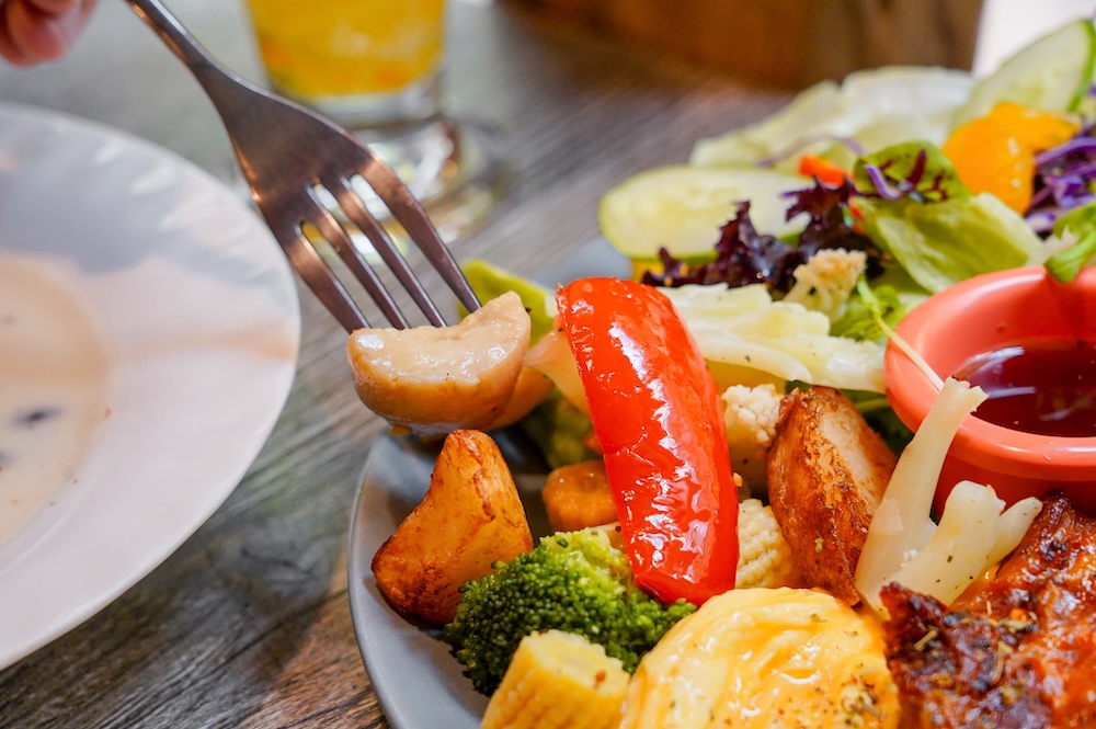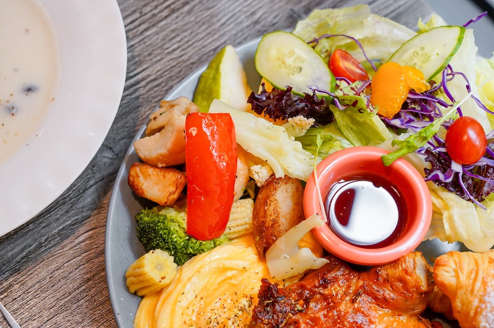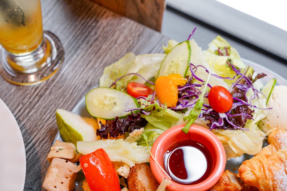 生菜沙拉裡面有用多種季節水果和生菜搭配,像我就有吃到芭樂、橘子、蕃茄和西瓜,吃起來非常的輕盈爽口,搭配特製的玫瑰果醋醬,酸甜中帶有玫瑰香氣,味道層次更豐富。