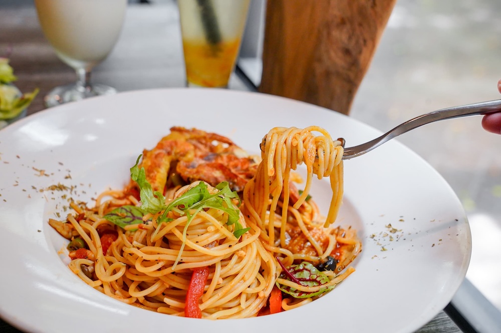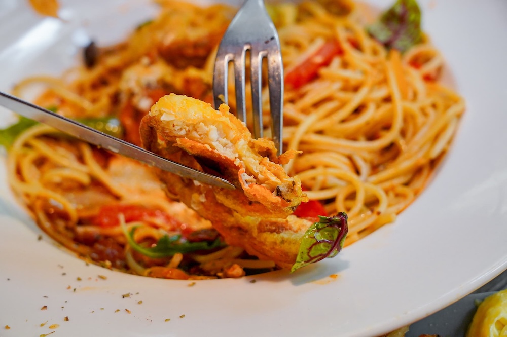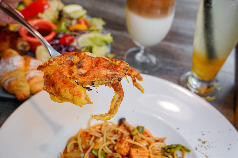 軟殼蟹處理得很乾淨,酥脆口感咬下去都能聽到咔滋聲,裡面的蟹肉鮮甜爽口,和QQ鹹香微辣的義大利麵,形成對比口感,吃起來更有層次感!