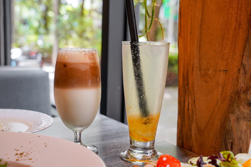 套餐飲料可以換80元飲品,超過需補差價!我們點了檸檬香柚氣泡飲和原味拿鐵,非常適合夏天消暑飲品!