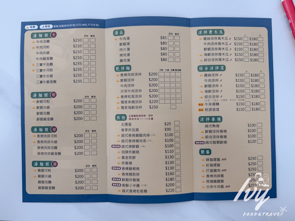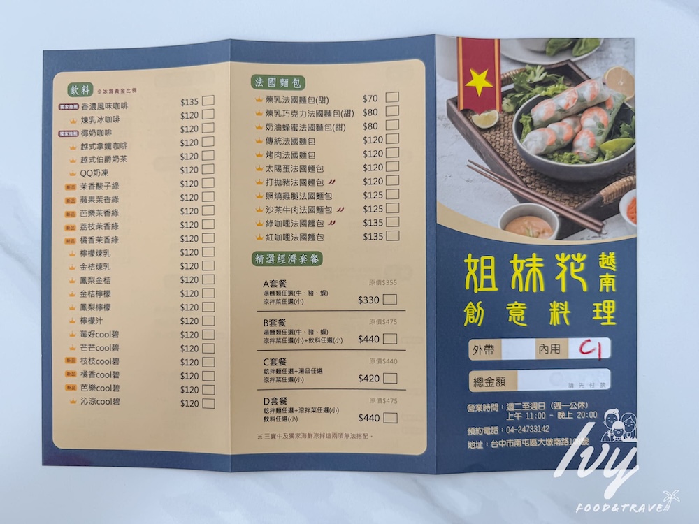 姐妹花越南創意料理大墩南店菜單,真的很佛心,沒有低消也沒有服務費!菜單品項少不了經典的越南美食,像是河粉、米線和泡麵,有涼拌和湯的,還有越式法國麵包、越式咖啡、越南春捲等,品項很多樣化,價格也不貴~