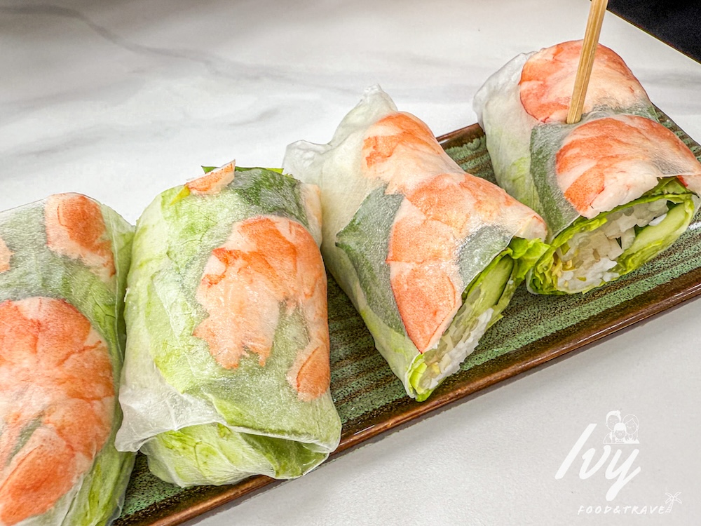 鮮蝦涼拌春捲,薄透的春捲皮,包裹著鮮甜的蝦肉、脆脆的蔬菜、QQ的米線,一口咬下,多層次的口,在佐上越式沾醬,鹹甜酸辣超好吃!