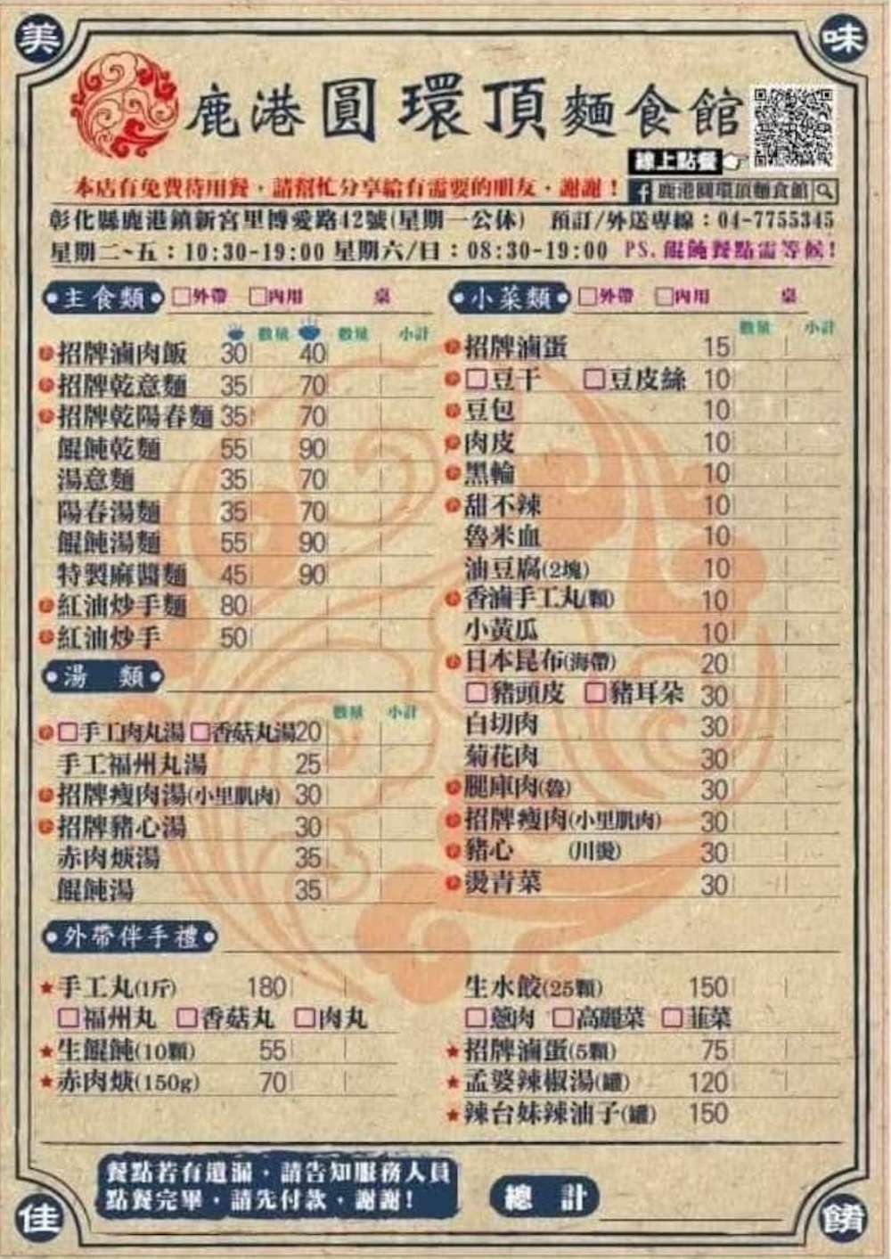 鹿港圓環頂麵食館,價格非常實惠,餐點口味都很得我心,尤其招牌意麵鹹香入味,讓人一口接一口,來鹿港老街逛逛時,不妨來這吃頓美味的鹿港小吃吧!