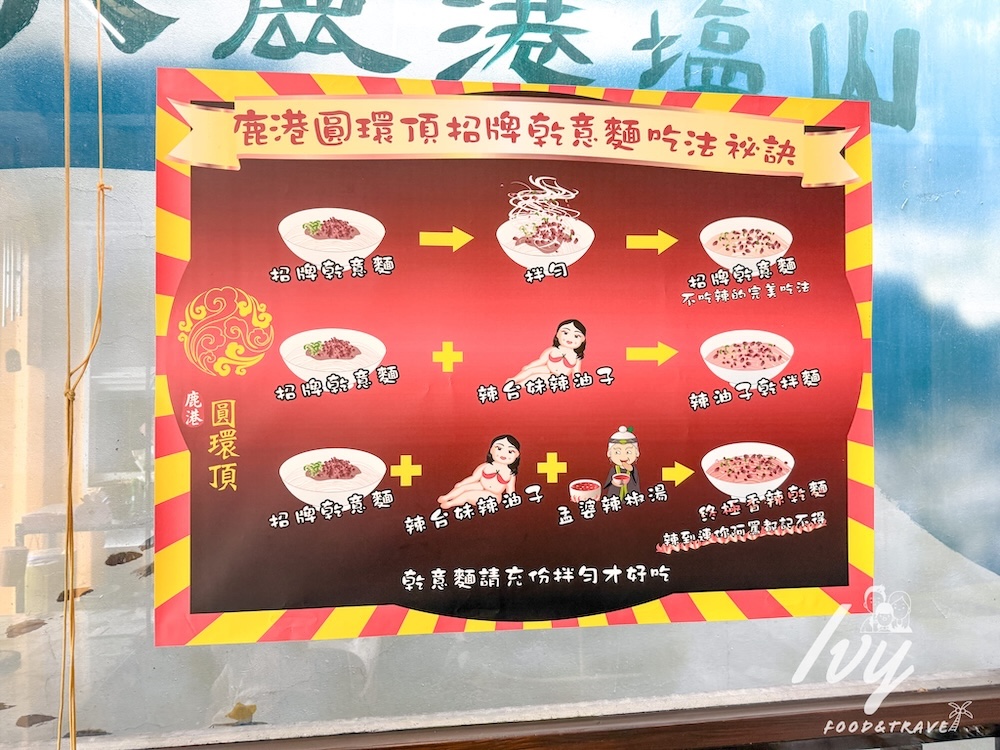 鹿港圓環頂麵食館的麵食有推薦吃法,可以加上他們的特製辣油子,變成辣勁十足的麵食。